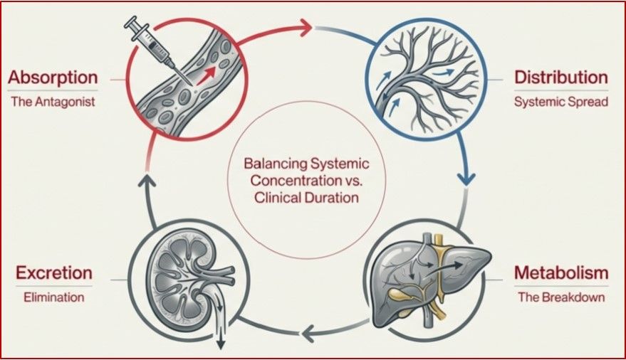A dedicated section explains the lifecycle of local anesthetics within the body, including absorption, distribution, metabolism, and excretion. The lecture highlights how injection site vascularity, protein binding, liver function, renal elimination, and patient-specific factors can influence drug effect and systemic toxicity.